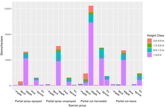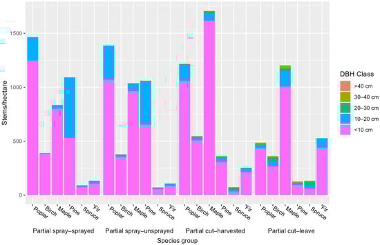 Between treatment corridors in the partial spray, a higher proportion of pine trees reached a DBH ≥10 cm in the sprayed corridors, while more poplar trees, along with more maple trees, reached a DBH ≥10 cm, in the unsprayed corridors (Figure 5). In the partial cut, the harvested corridors had higher densities of poplar and pine from postharvest regeneration, while the leave corridors had more spruce and fir trees from advance growth or residual overstory.