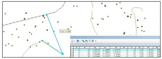 Figure 3. Illustration of vector data conversion. The green arrows indicate the straight-line distance from the current point to the river, while the blue arrows indicate the distance from the current point to the railway. The bold text in the first row of the table represents the feature names.