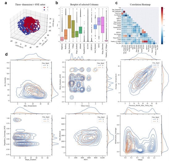 Following data cleaning, a joint kernel density estimation plot was used to further elucidate feature relationships and distributions (Figure 5d). The curve along the upper axis represents the distribution of the X-axis variable, while the curve along the right axis represents the distribution of the Y-axis variable. The central contour plot depicts the joint distribution of these variables. In the plot, blue regions indicate areas without fire occurrences, whereas orange regions represent areas where fires have occurred.