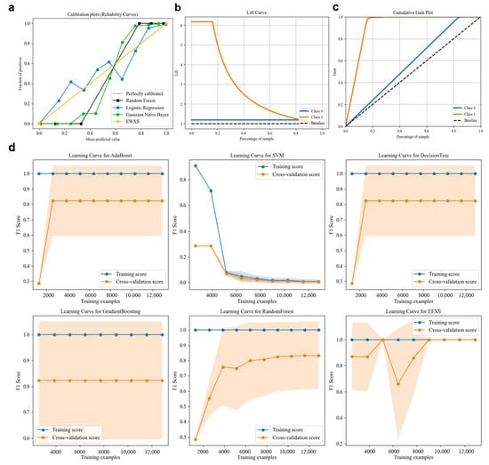In comparison to the Gradient Boosting Decision Trees (GBDTs), Random Forest, AdaBoost, and Support Vector Machine (SVM) models documented in the literature [9,10,13,14,25], the EWXS model demonstrates improvements ranging from 0.9% to 20.15% in accuracy, 1.31% to 74.19% in precision, 4.23% to 85.15% in recall, 2.81% to 81.58% in F1 score, and 0.06 to 0.462 in AUC. Additionally, Figure 6a illustrates the Reliability Curve, with the yellow line representing the EWXS model, which outperforms the other models. The Lift Curve in Figure 6b further highlights the ability of EWXS to identify positive samples across varying sample percentages, showing a significant improvement over random selection. Furthermore, Figure 6c presents the Cumulative Gain Plot, which demonstrates the EWXS model’s capacity to capture a higher proportion of positive samples within the top percentage of predictions compared to the other models. This plot confirms that EWXS consistently outperforms other algorithms by yielding a greater cumulative gain, thereby validating its effectiveness in detecting positive cases. The superior performance of the EWXS model across these five metrics can be attributed to several factors: XGBoost includes regularization terms that effectively manage model complexity and mitigate overfitting. Additionally, its parallel processing capabilities significantly accelerate training on large-scale datasets. The adaptable loss function framework of XGBoost is also applicable to a wide range of predictive problems, further demonstrating its broad applicability and superior predictive accuracy.