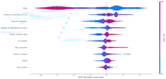 Figure 7 presents the ten most influential features, which include Distance to Administrative Village (Village), Monthly Average Fire Spot Rate in the City (Monthly_Fire_Spot_Rate_pre_City), Temperature Difference (Temperature_Difference), Monthly Average Fire Spot Rate in the County (Monthly_Fire_Spot_Rate_pre_Country), Weather Condition (Weather_Condition_WOE), Air Humidity (Air_Humidity), Maximum Temperature (Max_Temperature), Number of Surrounding Administrative Villages (Number_of_Village), Altitude (Altitude), and Slope Gradient (Slope_Gradient).