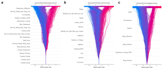 SHAP decision plots.: (a) Decision plot for meteorological factors, (b) Decision plot for human activity factors, (c) Decision plot for geographical factors.