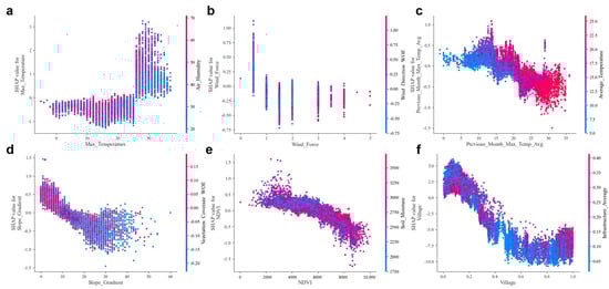 To gain deeper insights into how variations in key feature values affect the EWXS model’s predictions of wildfire occurrences, SHAP feature summary plots were used. Meteorological factors selected for this analysis include Temperature Difference (Max_Temperature), Wind Speed (Wind_Force), and the Previous Month’s Average Maximum Temperature (Previous_Month_Max_Temp_Avg). From the geographical factors, Slope Gradient (Slope_Gradient) and the Normalized Difference Vegetation Index (NDVI) were chosen, along with Village Distance (Village) from human activity factors. The SHAP dependence plots are shown in Figure 9. Specifically, Figure 9a–c displays interactions among meteorological factors, Figure 9d,e depicts interactions among geographical factors, and Figure 9f illustrates interactions among features related to human activity.