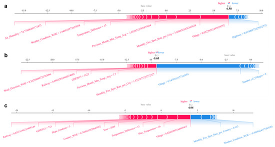 Figure 10a presents a SHAP force plot for a randomly selected sample predicted to experience a wildfire. Features highlighted in red contribute positively to the model’s prediction, indicating that these factors increase fire risk. Key factors include a distance of 0.3 km to administrative villages (normalized to 0.0223), as discussed in Section 6.2, where distances less than 2.7 km typically correspond to higher fire risk. Additionally, meteorological factors—such as an average minimum temperature of −1.05 °C from the previous month, a temperature difference of 15 °C on the day of the sample, and an average of 3.5 fires per month in the vicinity—are significant contributors to wildfire occurrence. However, the distance to the road negatively impacts the likelihood of fire in this sample. Notably, the factors influencing fire occurrence in this case are predominantly related to human activity and meteorological conditions, with geographical factors contributing less.
