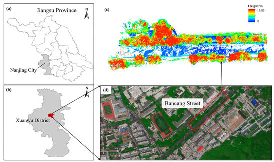 Overview of the study area: (a) location of Nanjing; (b) location of the study area; (c) TLS point cloud of the study area; and (d) a map image of the study area.