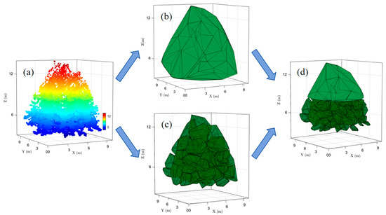 A 3DGV calculation: (a) point cloud of the sycamore canopy; (b) the convex hull method fitting of the 3DGV; (c) the k-means clustering convex hulls method fitting of the 3DGV; and (d) the CHCM method fitting of the 3DGV.