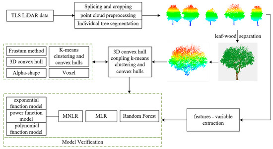 The technical flowchart of this study is shown in Figure 4. First, the TLS point cloud data were spliced, clipped, and segmented to obtain individual tree point cloud data. Second, the leaf point cloud was extracted through leaf–wood separation. Third, the 3DGV of individual trees was calculated using the CHCM, and the accuracy of the CHCM was verified by comparison and analysis combined with other methods. Finally, feature variables were extracted from TLS point cloud data and used to model and predict 3DGV.