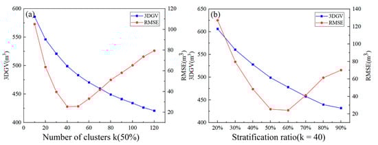 To calculate the 3DGV of individual trees using the CHCM, two parameters had to be determined: the stratification ratio and the number of clusters k. The optimal parameters of the CHCM were determined using the 3DGV calculated via the frustum method as the reference value (Figure 5). Based on the point cloud data density and multiple tests, the stratification ratio was set to 50%, and the value of k was changed. The results showed that as k increased, the 3DGV decreased, while the RMSE initially decreased and then increased, reaching the minimum value of 25.49 m3 when k = 40. Therefore, the value of k was fixed at 40 and tried to change the stratification ratio to further optimize the parameters. The results showed that the 3DGV decreased with an increasing stratification ratio, and the RMSE also presented a trend of first decreasing and then increasing, reaching the lowest value of 24.23 m3 at 60%. The optimal stratification ratio of the CHCM was 60%, and the optimal number of clusters k was 40.