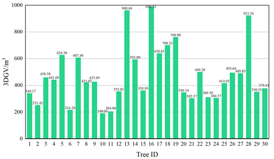 Figure 6 presents the 3DGV results calculated using the CHCM. The results demonstrate considerable variation in the 3DGV across the 30 trees, with the lowest value at 109.06 m3 and the highest at 990.33 m3.