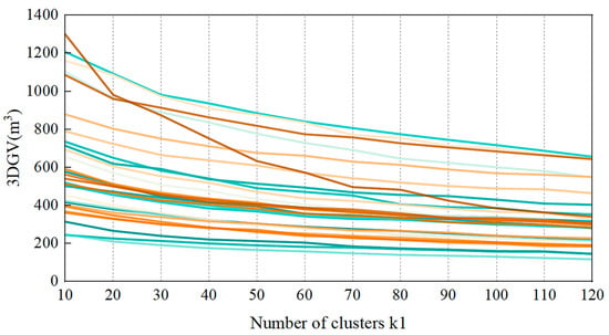 The number and size of convex hulls of the k-means clustering convex hulls method were determined by the number of clusters. To distinguish it from the k used in the CHCM, we denoted it as k1. According to the previous experimental experience, we set the range of k1 from 10 to 120 with a step size of 10 for calculating the 3DGV of 30 individual trees, as shown in Figure 7. As k1 increased, the 3DGV decreased progressively and stabilized when k1 reached 80. Consequently, k1 was set to 80 in this study.