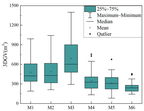 The boxplot of the 3DGV calculated by different methods is shown in Figure 8. The results indicate significant differences in 3DGV estimates across methods. The convex hull method exhibited the widest distribution range of 3DGV, and the mean and median values were significantly higher than those of other methods. This indicates that the convex hull method tended to overestimate the 3DGV and exhibited relatively high variability. The estimated 3DGV values by the k-means clustering convex hulls method, alpha-shape algorithm, and voxel-based method were generally lower, with a relatively concentrated distribution range. The mean value, median line, and data range of the frustum method and the CHCM were very close, indicating a high level of consistency between the results of the two methods.
