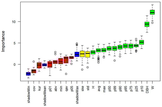 The Boruta algorithm was used to screen the 21 variables. The Boruta algorithm established a reference line for shadow features and categorized variables into three types: important, tentative, and unimportant features. Figure 9 shows the importance distribution of each variable. Among them, the blue boxplot represents the shadow feature; green denotes the important feature selected by the algorithm. For example, the importance of W and DBH was much higher than the upper limit of shadow features, indicating that these variables had a significant impact on 3DGV. Yellow represents tentative features, indicating that the importance of ske and std overlapped with the distribution range of shadow features. These features require further verification through additional research. Red denotes unimportant features, such as qav and p05, whose importance fell below the maximum threshold of shadow features, indicating a weak correlation with 3DGV. Therefore, according to the screening results, the two most important variables, W and DBH, were selected for subsequent modeling.