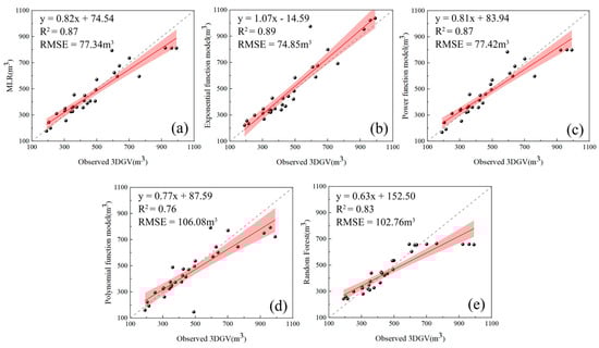 Before modeling, the Shapiro–Wilk test was conducted to assess the normality of the 3DGV data. The result showed a p-value of 0.0512 (p > 0.05), indicating that the data follows a normal distribution, allowing for the application of a parametric model. In this study, five types of models were considered for 3DGV fitting. For the 30 sycamore samples, 70% were randomly selected as the training set and 30% as the validation set. The relationship between the 3DGV predicted by the five models and the observed 3DGV obtained using the CHCM is shown in Figure 10 and Table 3.