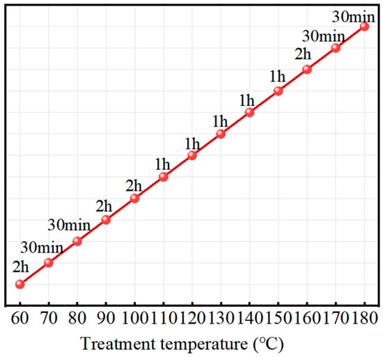 The flattened bamboo sheets were thermally modified in a 1 m3 pilot-scale drying kiln. A full factorial experimental design was implemented, with processing temperature (180 °C, 190 °C, 200 °C) and duration (2, 3, 4 h) as variables, totaling nine experimental groups. Two sheets per group were selected from the two culm segments with comparable material properties. The thermal modification process is shown in Figure 1.