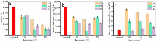 Thermally modified flat bamboo material’s mechanical properties; (a) hardness; (b) compressive strength along grain; (c) flexural modulus of elasticity.