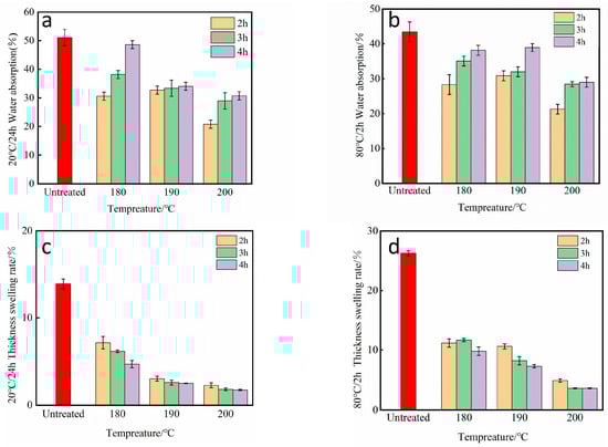 Change in water absorption rate and water absorption thickness expansion rate of thermally modified flat bamboo material: (a) water absorption of material treated in 20 °C deionized water for 24 h; (b) water absorption of material treated in 80 °C deionized water for 2 h; (c) thickness swelling rate of material treated in 20 °C deionized water for 24 h; (d) thickness swelling rate of material treated in 80 °C deionized water for 2 h.