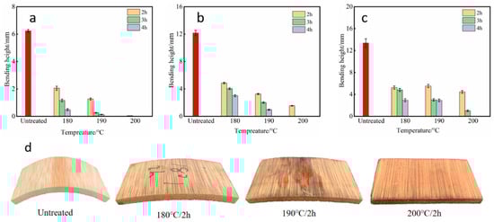 Thermally modified flat bamboo bending height changes: (a) 1 h; (b) 2 h; (c) 3 h. (d) Bending height after 2 h of treatment at different temperatures.