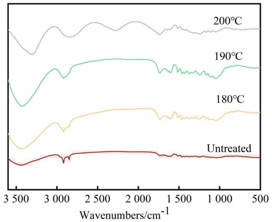 Infrared spectra of flattened bamboo board treated at different temperatures (3 h).