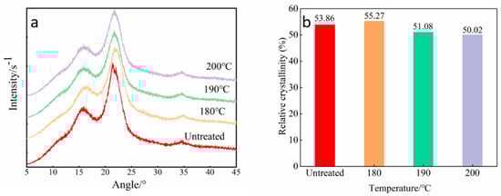 XRD pattern and relative crystallinity of cellulose of flattened bamboo board treated at different temperatures (3 h): (a) XRD curve of flattened bamboo board; (b) relative crystallinity.