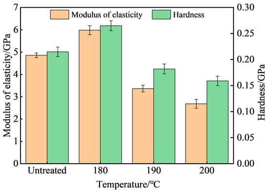 As shown in Figure 8, untreated specimens exhibited an elastic modulus of 4.86 GPa and hardness of 0.22 GPa. The nanomechanical strength of thermally modified flattened bamboo displayed temperature-dependent behavior: specimens treated at 180 °C demonstrated enhanced strength relative to untreated material, and those processed at 190 °C and 200 °C showed significant reductions. At 190 °C, the elastic modulus and hardness decreased by 43.79% and 31.32%, respectively. This trend paralleled the biphasic evolution of cellulose crystallinity observed in prior analyses: initially increasing at 180 °C due to amorphous matrix removal and molecular chain realignment and then decreasing at elevated temperatures (190–200 °C) as crystalline domains underwent thermal degradation. The progressive disruption of structural integrity at higher temperatures directly correlated with the diminished nanoscale mechanical performance because pyrolysis-induced chain scission compromised load-bearing capacity [36,37,38].