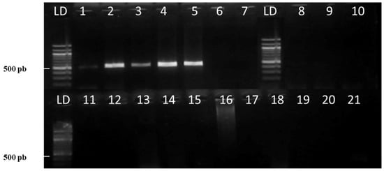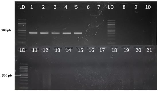 Conventional PCR-based specificity assays using Act-31F/Act-543R as molecular markers for the detection of the genus Corinectria spp. PCR amplification products of genomic DNA of Corinectria spp (lanes 1 to 5), negative controls with distilled water (lanes 6 and 7), and different fungal plant pathogenic species (lanes 8 to 19) using Act-31F/Act-543R molecular markers. Lanes 1 to 3—C. constricta (LASB 330, LASB 266, and LASB 352); lanes 4 to 5—C. fuckeliana (AR 239.69 and AR 3103.61); lane 8—Phomopsis tuberívora; lane 9—Diaporthe phoenicicola; lane 10—Diplodia sapinea; lane 11—Fusarium verticillioides; lane 12—Neonectria ditissima; lane—13 Clonostachys rosea; lanes 14 to 18—fungal endophytes isolated from P. radiata; lane 19—Phytophthora cinnamomic; lane 20—P. radiata; lane 21—negative control (H2Od).