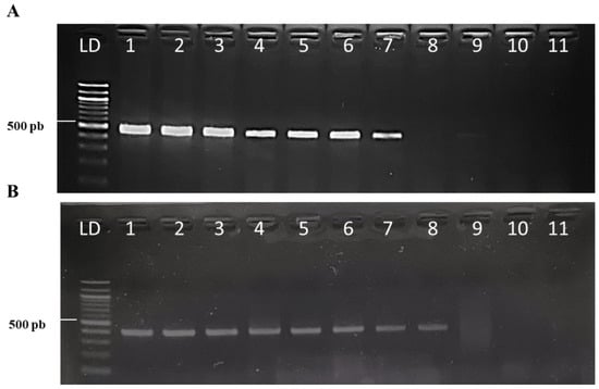 Sensitivity test of molecular markers. PCR amplification products of C. constricta genomic DNA at different dilutions using the following molecular markers: (A) Act-31F/Act-543R and (B) BtubF/BtubR. Lane 1—25 ng; lane 2—10 ng; lane 3—5 ng; lane 4—2 ng; lane 5—1 ng; lane 6—0.5 ng; lane 7—0.1 ng; lane 8—0.05 ng; lane 9—0.025 ng; lane 10—0.012 ng; lane 11 control (ddH2O).