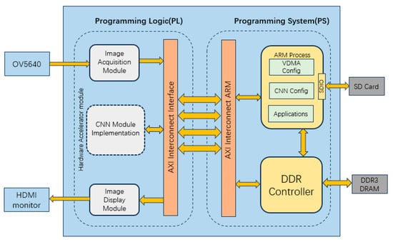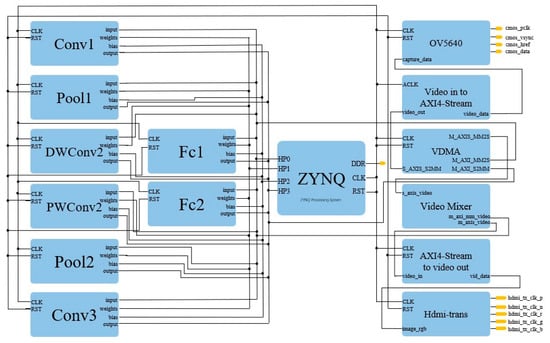 Figure 1 shows the FPGA development board structure. We have adopted an integrated edge device architecture, which takes the Zynq Z7 Lite 7020 SoC development board as the core (as shown in Figure 1), supplemented by a camera module and LCD display module. As the core of the development board, the Zynq7020 chip is composed of a processing system (PS side) and a programmable logic module (PL side) composed of two ARM Cortex-A9 processors. The two components (PS and PL) closely cooperate through the high-speed AXI (Advanced eXtensible Interface) bus to achieve efficient collaboration between software and hardware. The PS terminal is responsible for loading LightFireNet parameters, processing characteristic data, displaying recognition results, and controlling the entire recognition process. The PL terminal focuses on image acquisition and provides hardware acceleration support for LightFireNet. We chose the OV5640 CMOS camera to capture images. The camera is connected to the PL end, and the image data are transmitted to the DDR3 memory of the PS end through the AXI VDMA interface for LightFireNet processing. The network parameters are stored on the SD card. When the system starts, the ARM processor on the PS side reads these parameters from the SD card to the memory. Finally, the ARM system on the PS side is responsible for transmitting image data and network parameters to the LightFireNet on the PL side, controlling the operation of the accelerator, and displaying the fire recognition results on the LCD screen in real-time.