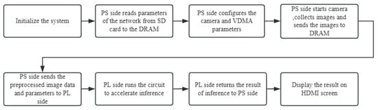 As shown in Figure 2, during the startup of the forest fire recognition system, the system first performs power-on initialization. Subsequently, the ARM processor reads the LightFireNet model parameters from the SD card to the DRAM. The PL terminal hardware circuit starts; the camera and VDMA module complete the initialization configuration, start capturing RGB images, and transmit data to DRAM through DMA. The ARM processor on the PS side performs the image scaling and normalization preprocessing and then sends the preprocessed image data and model parameters to the PL side. The LightFireNet acceleration circuit on the PL side calculates and returns the result to the PS side through the AXI bus. The ARM processor superimposes the detection results on the collected images and displays the final results through the HDMI display. This system process is automatic and efficient, ensuring real-time and accurate fire detection.