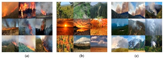 To better simulate the complex background environment of forest fires, images with intricate backgrounds were selected from the Kaggle dataset website to construct a dataset containing three types of samples: fire, non-fire, and smoke, totaling 5553 images. These images cover various scenarios, including forest fires, natural states of forests without fire, and smoke in forests. Additionally, to train a more robust model, the dataset also includes complex samples such as fire clouds, white clouds, and red-leaf forests. Figure 3 shows pictures of some typical datasets: (a) depicts fire images, including small and large fires; (b) shows no-fire images, including fire clouds, red-leaf forests, and clouds resembling smoke; (c) displays smoke images, including light and heavy smoke. This dataset provides comprehensive coverage of various forest fire scenarios, offering rich samples for model training and evaluation. It is worth emphasizing that the effectiveness of the above data enhancement technology needs to be verified by the actual training effect. The experimental results in Section 3.2 and Section 3.3 in this paper show that the data enhancement technology can effectively solve the problem of imbalanced categories of existing datasets. In addition, the preprocessing part comprised four key steps: data cleaning, data augmentation, standardization, and stratified splitting. Each step was designed to enhance data quality, address class imbalance, and ensure compatibility with hardware constraints.