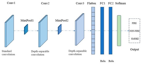When designing a lightweight CNN model for forest fire recognition, two core requirements need to be met: first, the model must have high accuracy in fire and smoke recognition to deal with a complex situation in an actual field environment; secondly, the computational and storage complexity of the model should be low enough to enable it to run efficiently on edge devices with limited resources. Based on these requirements, we designed a lightweight network, LightFireNet (as shown in Figure 4), which has a lightweight network structure consisting of seven layers, including three convolution layers, two pooling layers, and two full connection layers.