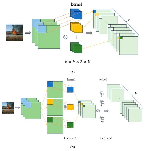 The parameters and computation of LightFireNet mainly focus on convolution operation. In order to improve the real-time performance of network edge implementation, the network adopts depthwise separable convolution as an efficient alternative to standard convolution. This technique operates through a two-stage process: first, by applying channel-specific spatial filtering via depthwise convolution with 3 × 3 kernels, followed by cross-channel feature integration through 1 × 1 pointwise convolution. The decoupled design significantly reduces computational load while preserving the network’s hierarchical learning capability. The implementation benefits are particularly pronounced on FPGA platforms, where the separable structure enables the pipelined execution of depthwise and pointwise stages, reducing DSP block usage and optimizing memory access through intermediate feature compression. Figure 7 visually contrasts the simultaneous channel processing of traditional convolution (a) with the factorized approach of depthwise separable convolution (b), highlighting its hardware-friendly architecture that balances efficiency and recognition performance.