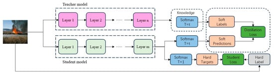 Considering the limited computing power and memory of the edge terminal, and to ensure the accuracy of forest fire smoke recognition, the method of knowledge distillation is used to train LightFireNet. Knowledge distillation is a method proposed by Hinton et al. [] to learn small models from large models. The idea of knowledge distillation is based on the assumption that the average prediction of different models can achieve higher accuracy than that of a single model. Because this will lead to a huge additional computational workload, knowledge distillation combines the knowledge of different networks into a new and simpler network. The original model is called the teacher. This new model is called the student. Based on the output of the teacher network, the weights and biases of the student network are adjusted by random gradient descent. In order to ensure the accuracy of forest fire smoke recognition, the method of knowledge distillation is used to train LightFireNet. Compared with the teacher network, LightFireNet obtained through knowledge distillation has a significantly reduced network size but retains a high accuracy rate close to the teacher network. The process of knowledge distillation is shown in Figure 8.