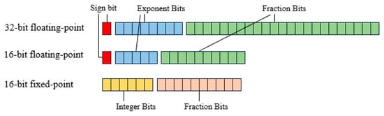 The basic principle of quantization technology is to convert the neural network data originally represented by 32-bit floating point numbers into fixed point numbers or low bit width floating point numbers, thus reducing the memory occupation and computational complexity. Specifically, (1) Half float has a 16-bit floating point representation, provides a large dynamic range, and can retain the flexibility of floating point numbers to a certain extent. It is suitable for models with high precision requirements. (2) With Ap_fixed<16,6> (16-bit fixed-point number), the data are represented by assigning 10-bit integers and 6-bit decimals, which can significantly reduce the power consumption while reducing the hardware resource requirements. The schematic diagram of three types of data structures is shown in Figure 10. It is applicable to the part with limited computing resources and low dynamic range requirements.