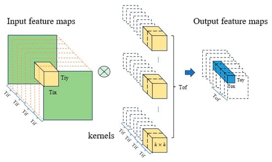 Because FPGA on-chip cache resources are usually very limited, it is impractical to cache all input characteristic graphs and weights in on-chip memory. Therefore, the data-blocking processing strategy must be adopted. As shown in Figure 11, each memory access only involves the Tix × Tiy-sized pixel blocks in the Tif input feature map, the corresponding Tif × k × k weight parameters in the Tof convolution cores, and the Toy × Tox-sized pixel blocks in the Tof output feature map. It should be noted that since the convolution kernel size k is small, it is not divided in this dimension. Combined with cyclic switching, after the data reuse mode is determined, the data in the on-chip memory can be effectively reused by reasonably designing the blocking strategy, effectively reducing the number of memory accesses and the amount of memory access data, and ensuring that memory access will not become the main bottleneck of accelerator delay.