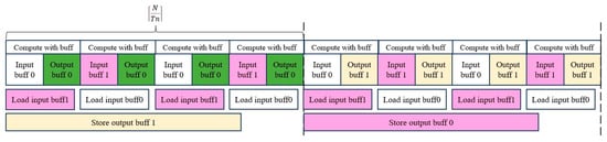 Figure 12 shows the timing relationship between the calculation and data transmission stages. In the first stage, the calculation engine uses the input buffer 0 for data processing and copies the data in the next stage to the input buffer 1. The next phase will perform alternate operations. When the calculation and data copy of the (N is the number of channels in the input feature map and Tif is the number of channels in the input feature block) phase are completed, the resulting output feature map is written into DRAM. The storage operation is executed in the phase, storing the results in the output buffer 0 until a new result is generated in the output buffer 1. In addition, these two independent loading and storage operation mechanisms are applicable to any other data reuse situation in this framework.