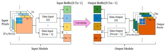 Considering that the actual bandwidth of DRAM is larger than the bus bandwidth of a single interface, the transmission delay can be effectively reduced through multi-channel input and output. Figure 13 further clarifies the specific implementation process of multi-channel data transmission, wherein represents the number of AXI Master interfaces for the concurrent reading of feature maps and represents the number of AXI Master interfaces for the concurrent writing back to DRAM. The I/O module is divided into input/output sub-modules, wherein each sub-input module reads the pixel blocks of output feature maps from DRAM to the on-chip cache and each sub-output module writes the pixel blocks of output feature maps from the on-chip cache to the chip cache outside. First, the input module will read Tif Tiy ×Tix-sized input feature pixel blocks from memory in order, and each pixel block will be read and distributed to Tif-independent on-chip input caches in a priority order. After calculation, the output module will read Toy × Tox-sized pixel blocks from Tof-independent on-chip output caches in order to write them back to the chip. There is no dependency between each sub-module, and data transmission can be completed concurrently, further improving the efficiency of data processing.