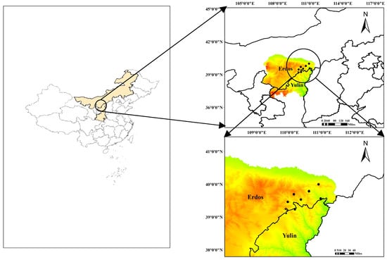 The study was conducted in Junger Banner County and Shenmu County, which are located in Ordos City and Yulin City, respectively, in the northern Loess Plateau region (39°26′–39°56′ N,110°32′–111°06′ E), Inner Mongolia and Shaanxi Province, China. The study area lies at an elevation of 800–1500 m above sea level and experiences a temperate continental monsoon climate. The average annual temperature ranges from 8.9 °C to 10 °C, while the average annual precipitation is approximately 400.7 mm, with rainfall concentrated in July, August, and September, accounting for 70% of the annual total. The potential annual evaporation is estimated at 1800–2000 mm. The region is characterized by an average wind speed of about 3 m·s−1 and more than 30 days of strong winds per year. These climatic factors contribute to widespread wind erosion of landforms, loose soil structures, and weak resistance to external impacts and cohesion in the area [27] (Figure 1).