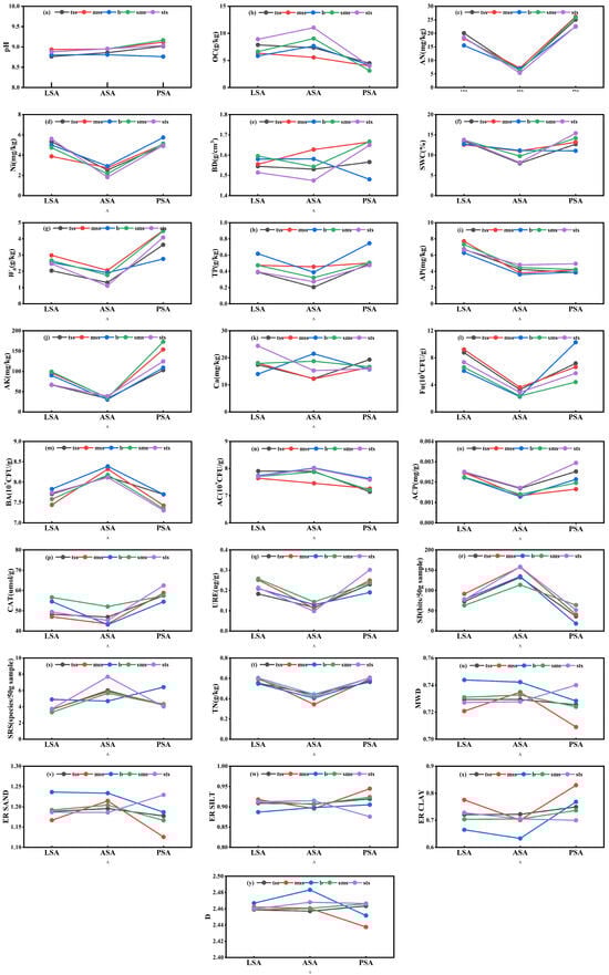 In the Pisha Sandstone areas, soil plays a crucial role as it serves as a medium for microbial activity and vegetation survival. It also retains moisture and facilitates nutrient cycling. A healthy soil environment provides favorable conditions for vegetation growth, regional land productivity, and human activities [43,44]. To objectively and accurately assess soil conditions, the study selected physical, chemical, and biological indicators to evaluate the soil’s status, offering a theoretical basis for ecological construction in the study regions. The uniqueness of the study area lay in the distinctive lithology of the sandstone, where the soil layer is relatively thin. The surface soil, consisting of sand, becomes muddy upon contact with water and is easily eroded during rainfall. Apart from soil pH and bulk density, significant differences in soil composition were observed across different study areas. The general trend is as follows: LSA > PSA > ASA, with ASA showing significantly lower content compared to LSA and PSA. Soil indicators such as total nitrogen (TN), ammonium nitrogen (AN), nitrate nitrogen (Ni), soil water content (SWC), water holding capacity (Wh), total phosphorus (TP), available phosphorus (AP), and available potassium (AK) were generally slightly higher in PSA compared to LSA and significantly higher than in ASA. The causes of these differences may be attributed to variations in soil texture, human activities, and different levels of erosion impacts [45,46,47]. The results indicated that the sand enrichment rate in PSA soil particles was lower than that in LSA and ASA, while the enrichment rates of silt and clay were relatively higher, particularly in the middle of the slope and at the bottom of the ditch. This suggests that, compared to PSA, the finer soil particles in LSA and ASA were more prone to erosion, leaving behind only coarse particles at the original slope positions. This was unfavorable for maintaining soil quality. Due to the substantial influence of human activities, soil quality in the LSA was found to be superior. This trend was more commonly observed in the study areas.