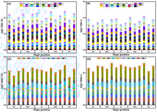 Soil quality index with total datasets and minimum datasets under non-linear and linear scoring methods and weight distribution at each slope position. (a) Soil quality index with total datasets under non-linear scoring method (SQI TDS NL), (b) soil quality index with total datasets under linear scoring method (SQI TDS L), (c) soil quality index with minimum datasets under non-linear scoring method (SQI MDS NL), (d) soil quality index with minimum datasets under linear scoring method (SQI MDS L). Different slope positions in figures: tss: sunny top slope; mss: sunny middle slope; b: bottom of the trench; sms: shady middle slope; sts: shady top slope.