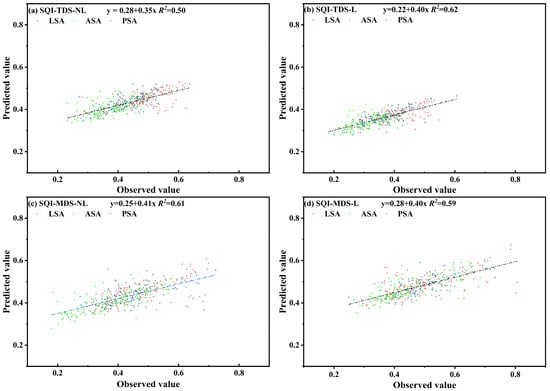 Random Forest model regression prediction in different soil quality indexes resulted from mean weight diameter (MWD), enrichment rate of sand (ERsand), enrichment rate of silt (ERsilt), enrichment rate of clay (ERclay), and fractal dimension (D). (a) Soil quality index with total datasets under non-linear scoring method (SQI TDS NL), (b) soil quality index with total datasets under linear scoring method (SQI TDS L), (c) soil quality index with minimum datasets under non-linear scoring method (SQI MDS NL), (d) soil quality index with minimum datasets under linear scoring method (SQI MDS L). Loess soil area (LSA), aeolian soil area (ASA), Pisha sandstone area (PSA).