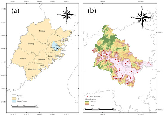 The geographical location and elevation of the main urban area of Fuzhou City and Minhou County. (a) Counties included in the study area; (b) distribution of the ancient banyan trees surveyed in the study area.