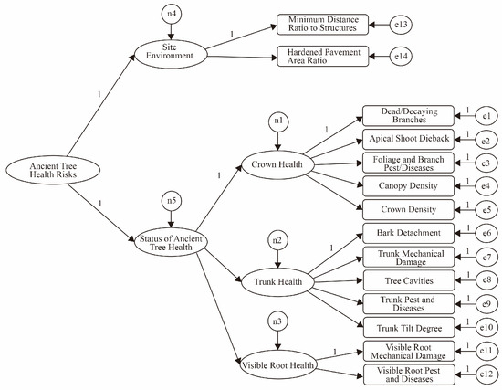 The theoretical model for health risk assessment of ancient banyan trees. Note: e1~14 represent the error variables for the manifest variables; n1~5 represent the error variables for the latent variables.