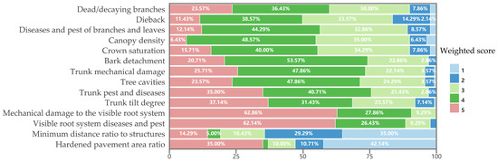 In terms of individual evaluation indicators, apart from visible roots, those with larger weights include dead or decaying branches, tree cavities, and mechanical damage to the trunk, while those with smaller weights include canopy closure, trunk tilt degree, and crown saturation. In comparison with similar studies, Zhou et al. [25] conducted a health evaluation of 10 banyan trees and found that canopy closure (0.022) and trunk tilt degree (0.020) had lower weights, which is consistent with the results of this study. Differences in other results compared to this study may arise from their limited sample sizes and smaller study areas. The weight proportions obtained from studies on different regions and tree species vary slightly: Hickman et al. [29] evaluated the health of 695 oak trees and found that trunk inclination had a significant impact on health; Júnior et al. [46] assessed the health of 14 trees in Brazil and identified trunk health as an important factor affecting tree health; and Srivanit et al. [37] evaluated the health of 3659 trees from 139 species and concluded that indicators such as dead branches, tree cavities, and mechanical damage to the trunk were the main factors influencing tree health, which aligns with the findings of this study. These results highlight the importance of considering the uniqueness of study sites and tree species in the evaluation system. The varying climatic and environmental conditions of different study sites, as well as the distinct morphological characteristics of different tree species, contribute to the differences in health evaluation results.