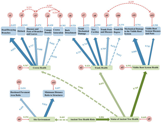 Based on the factor loadings obtained from the SEM analysis, the weight coefficients for the five latent variables and fourteen manifest variables can be calculated (Table 6). The results show that, in the evaluation of the health status of ancient banyan trees, the weight of visible root system health is the largest, at 0.245, indicating its significant impact on the health status of ancient banyan trees. The weight ratios of trunk health and canopy health are similar, suggesting that they also have a certain influence on the health status of ancient banyan trees.