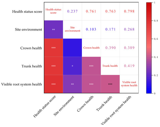 Heatmap of correlation coefficients for health risk assessment indicators of ancient banyan trees. Note: “*” indicates p < 0.05, “**” indicates p < 0.01, and “***” indicates p < 0.001.