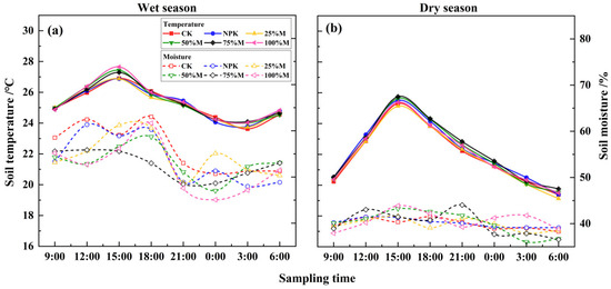 Daily variation of soil temperature and moisture between wet season (a) and dry season (b).