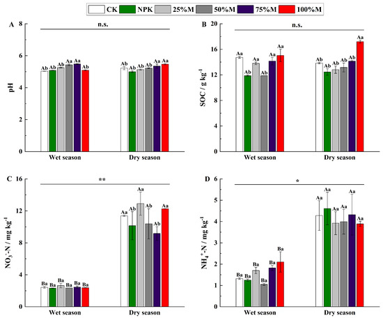 Soil physicochemical properties of different treatment groups during the study period. (A) soil pH; (B) SOC; (C) soil NO3−-N; (D) soil NH4+-N. Values in the bar graphs are means ± standard error (SE). Different lowercase letters represent significant differences among the different treatment groups. Different capital letters represent differences between the wet and dry seasons for the same treatment. In this case, the average values for the dry and wet seasons were compared. * p < 0.05, ** p < 0.01, n.s. indicates non-significant.