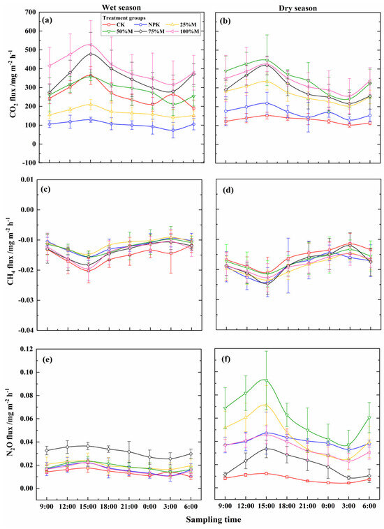 In this study, the trend of soil N2O fluxes also showed a significant single-peak curve, with the daily variation being higher during the day than at night, implying that the amount of N2O emitted during the day was higher than at night. There were also significant differences in soil N2O fluxes between the wet and dry seasons, with the difference being that there was no significant difference in soil N2O fluxes between treatment groups in the wet season, while there was a significant difference in the dry season. In the wet season, the maximum value of soil N2O fluxes also occurred at 15:00 and the minimum value at 3:00, with a range of 0.0101–0.0364 mg m−2 h−1. N2O fluxes were higher in all treatment groups than in the CK treatment group, which showed 100%M > 25%M > 50%M > NPK > 75%M > CK (Figure 4e). In the dry season, the maximum value of soil N2O fluxes also appeared at 15:00 and the minimum value appeared at 3:00, with a variation range of 0.0042–0.0965 mg m−2 h−1. N2O fluxes in all treatment groups were also higher than that in the CK treatment group, as shown by NPK > 50%M > 25%M > 75%M > 100%M > CK (Figure 4f). The N2O fluxes were similar to CO2 fluxes in terms of overall changes.
