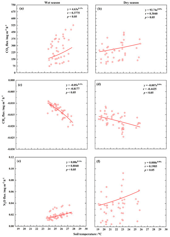 Correlation analysis of soil GHGs. CO2 (a,b), CH4 (c,d), and N2O (e,f) fluxes with soil temperature during the wet and dry seasons.