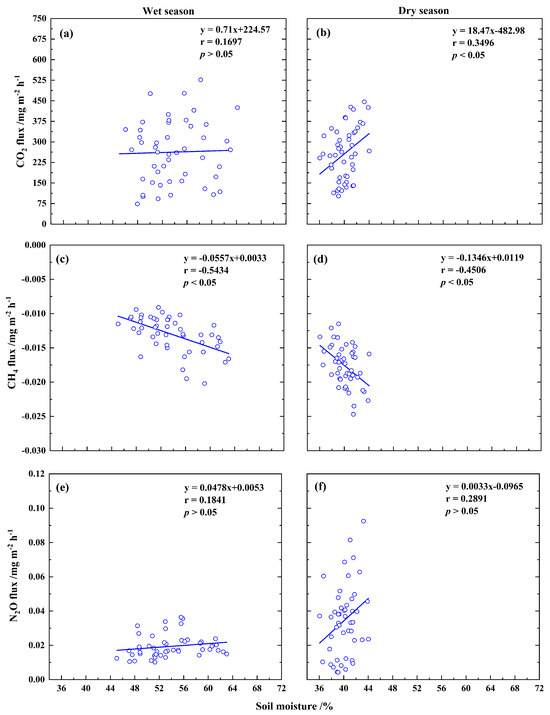 Correlation analysis of soil GHGs. CO2 (a,b), CH4 (c,d), and N2O (e,f) fluxes with soil moisture during the wet and dry seasons.